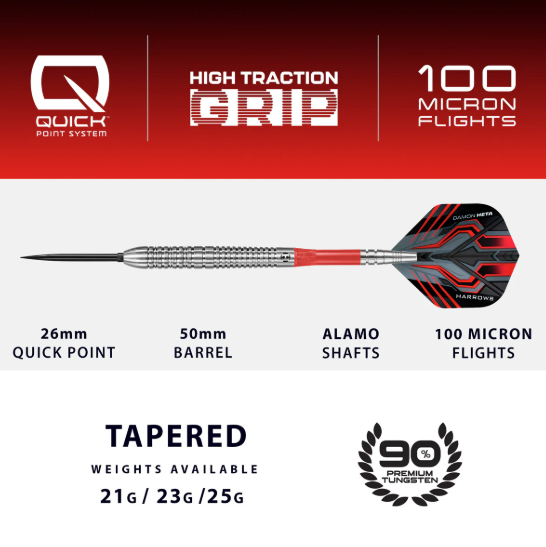- Complete Setup: Supplied with short Alamo shafts and Damon’s signature 100-micron flights.
