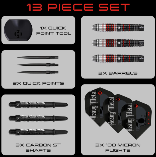 • Complete Setup: Supplied with Midi Clear Carbon ST Shafts and Ryan’s 100-micron Signature “Heavy Metal” Flights.