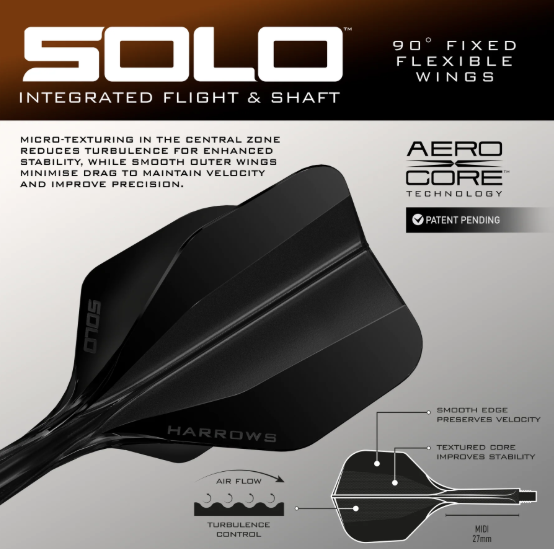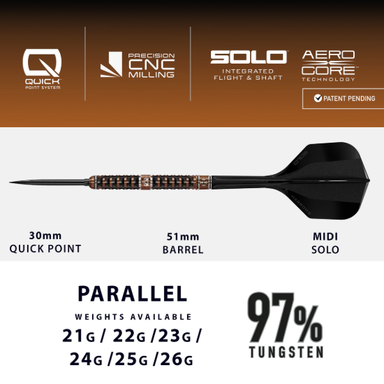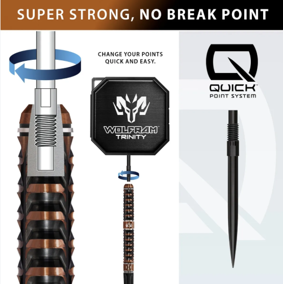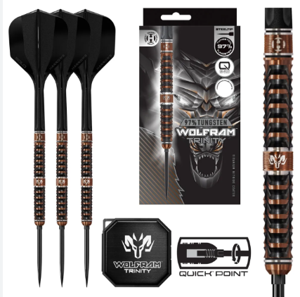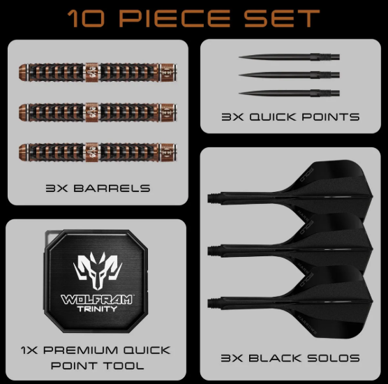 Wolfram Trinity comes supplied with 26mm Quick Points (steel tip), Midi black Solo integrated flight and shaft and a Premium Wolfram Quick Point tool, delivering a complete, ready-to-play premium setup straight out of the box.