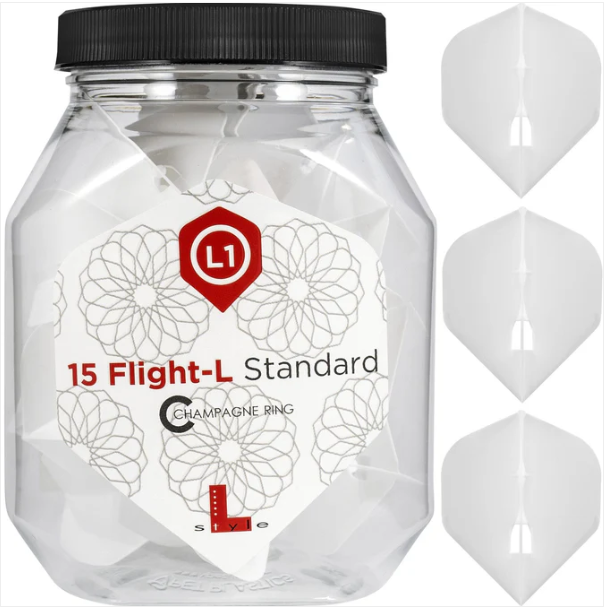 L-Style Champagne Ring L-Flight Soft – Tub – 15 pieces (5 Sets). One piece moulded. Strong and rigid for a true flight path. Use with the unique champagne rings to ensure maximum grip to the nylon shaft. NB Only to be used with nylon shafts. L-Style – L-Flights – L1 Pro – Champagne Ring – Standard – White – 5 Sets