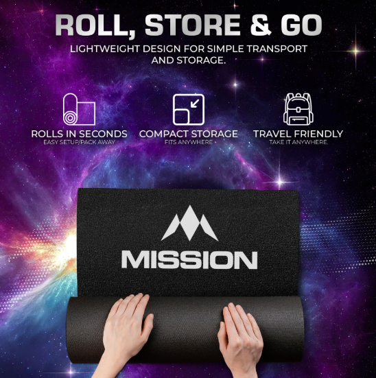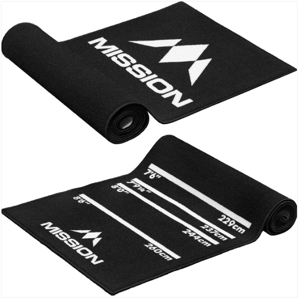 The carpet mat incorporates both official tournament specification oche measurements and the Mission logo. The mat’s lightweight construction means that it is easy to roll out, transport and store away. Mission Carpet Darts Mat – Black with Logo.