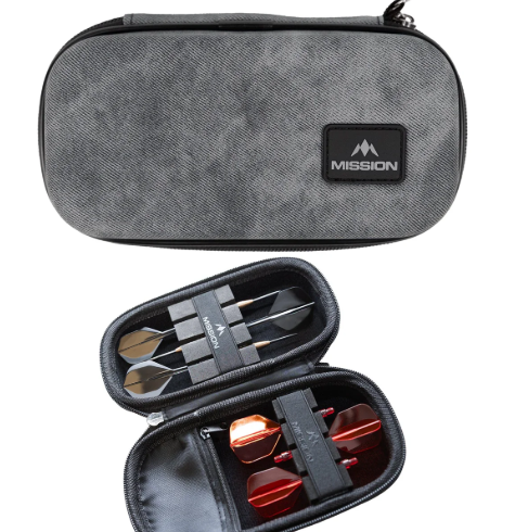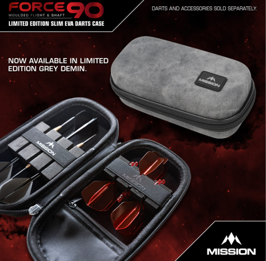 Mission Force 90 Dart Case – EVA Moulded Wallet – Limited Edition – Slim – Grey Denim. Keep your darts equipment safe and secure with the Mission Force 90 EVA Dart Case. Made from a strong EVA material, this case will keep your darts and accessories secure for when you are on the move and travelling to your next darts match. This darts case can hold two sets of fully assembled darts on one side, along with a specifically designed compartment on the other side to hold spare Mission Force 90 flights. Darts and flights are not included.