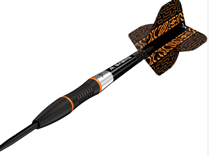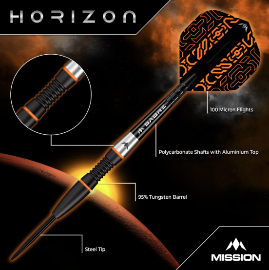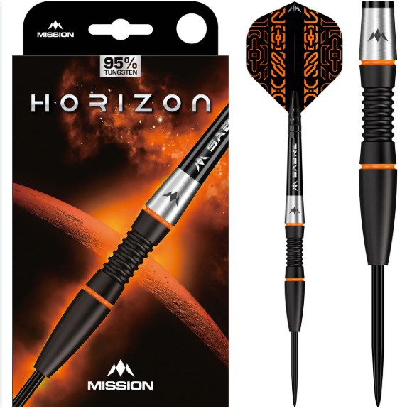 Mission Horizon Darts – Steel Tip – 95% Tungsten – Black PVD & Orange – 22g. Unearth new possibilities to your game with the Mission Horizon Darts! These darts are made of a premium 95% tungsten material and are complete with a black PVD and orange coating on the barrels. The centre section of the fully contoured barrel has a micro scallop with radial grooves with two small smooth sections either side, all finished with a black PVD coating. Two orange painted highlighted rings separate the centre of the barrel from the smooth rear and front sections. The full radius front section of the barrel has a black PVD coating and leads to a smooth black point, with a smooth natural tungsten section at the rear complete with a laser-etched Mission logo. The Horizon dart is complete with a set of short black Mission Sabre shafts which tightly grips the signature Mission Horizon flights