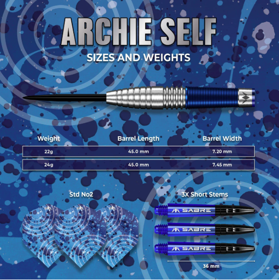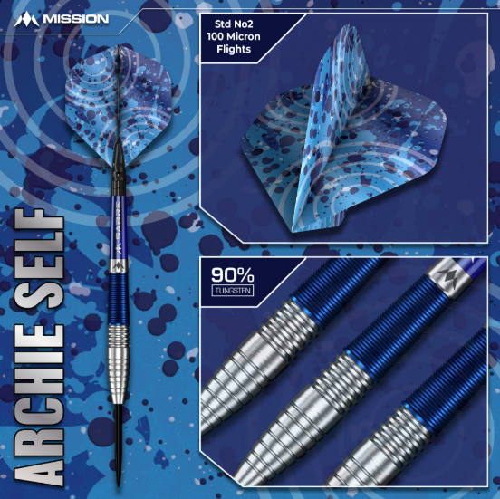 Mission Archie Self Darts – Steel Tip – 90% Tungsten – Blue & Silver – 24g. Rise to prominence on the oche with the Mission Archie Self Darts! ‘The Archer’ is one of England’s brightest young prospects and showcased his immense potential by winning the 2024 WDF Boys World Championship at Lakeside. Self’s first set of signature Mission darts are made from a 90% tungsten material. The torpedo shaped dart is inspired by one of the brand’s classic darts, the Mission Crypt, and has been designed in collaboration with the England youth international. The front section of the barrel includes two sections of ring grip which leads to a smooth black point. The rear section of the barrel features a micro razor grip that is complete with a striking blue PVD coating that leads to a small smooth section with a laser-etched Mission logo. Self’s signature Mission darts are complete with short blue Mission Sabre shafts with black tops and the world champion’s own signature Mission flights. Available in steel tip (22g and 24g).