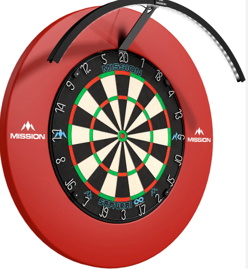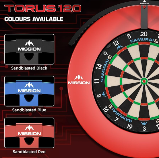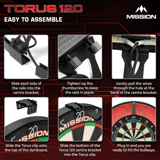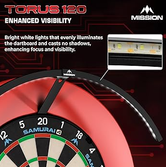 Mission Torus 120° – Lighting System – Bright White LED – Black. The Mission Torus 120 is the newest addition to the revolutionary Mission Torus dartboard light family! Available in three different colours (sandblasted black, blue or red), the Torus 120 has been designed to provide players with an easy and effective way to light up your dartboard. The Torus 120 is a lightweight and portable solution as it folds up small to fit into your luggage, perfect for when you are playing darts on your travels, or even at home it can be stored away when not in use. The 120-degree framed light features bright white LED lights to provide a perfectly lit dartboard to play on, as well as ease of access to retrieve your darts after each throw. This lighting system is quick and easy to assemble and can clip to the top of any steel tip dartboard with no screws required. The Torus 120 has a USB-C connector with no plug supplied.
