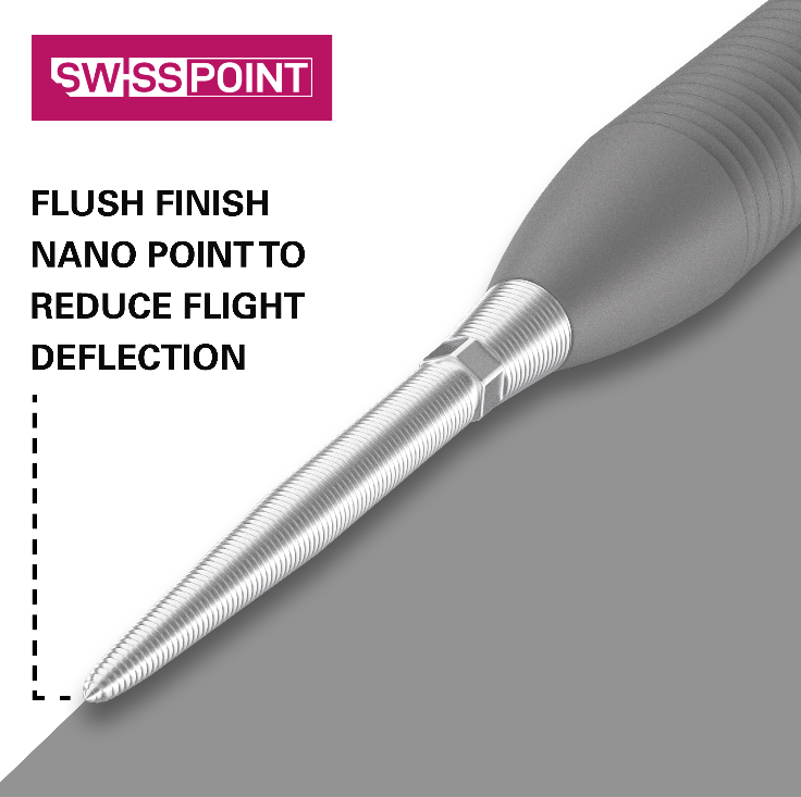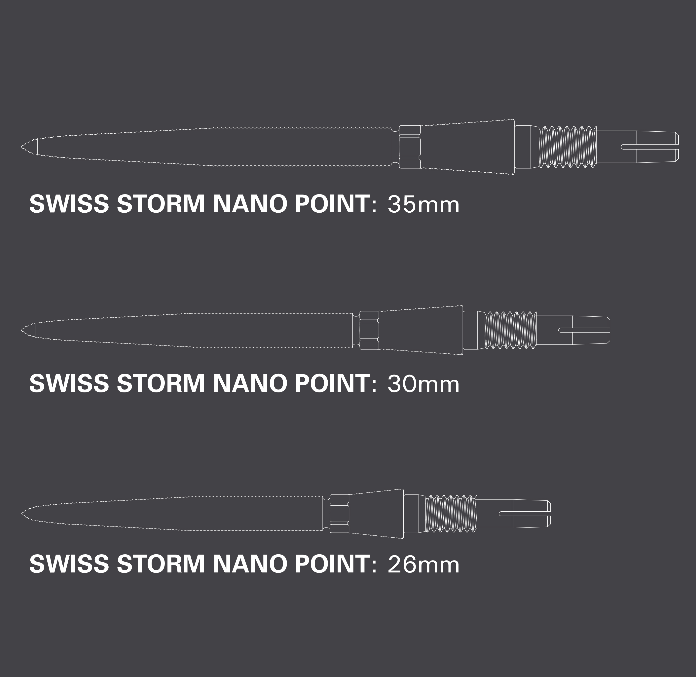 The Swiss Storm Nano points combines Swiss Point Technology, and the best-selling Storm range. Designed to sit flush with the barrel, featuring laser etching to provide added finger grip and secure dartboard entry. Crafted from premium Stainless Steel and further strengthened through a vacuum hardening process, these points offer increased durability and reduced flight deflection.