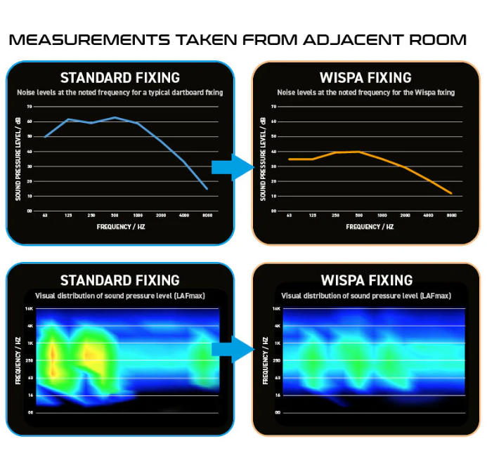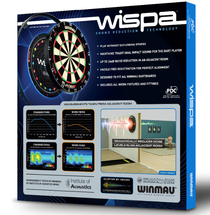 WISPA’s radical and patented sound reduction system all but eliminates kinetic sound transfer from darts entry into the dartboard creating the quietest playing system in the World.